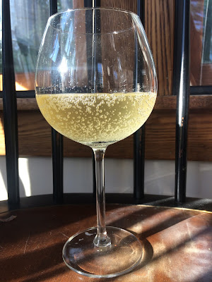 This cider looks fairly traditional, nice medium straw color, great clarity and some real bubble action. The picture fails to show the clarity because of the glass fogging, but its there.